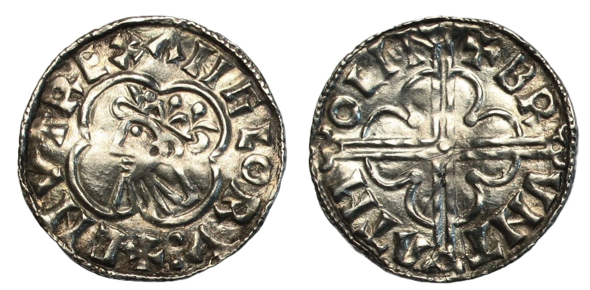 Penny, quatrefoil type, Lincoln, moneyer Bruntat, draped bust left within quatrefoil, legend commences at 6 o'clock +CNVT REX ΛNGLORV:, rev. long voided cross over quatrefoil with pellet cusps and pellet centre, +BRVNTΛT MO LIN, 1.00g, (SCBC 1157, N.781). Slight crease, about very fine