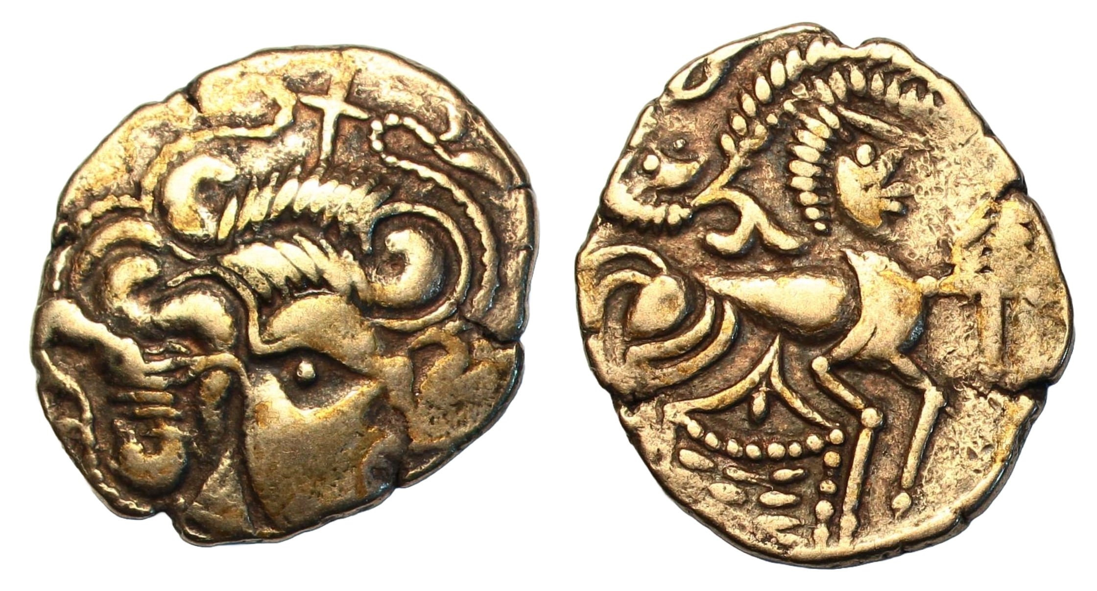 Osismii Stater, 80-50 BC, pale gold, tent type, head right, rev. human headed horse right, charioteer an upward facing head, 'feathered' cord over horse's head ending in cross, 'tent' motif below, 6.93g, (de Jersey fig 41, de la T cf 6504/6512, DT 2210). Obverse slightly off centre but good detailed horse, overall good very fine and scarce