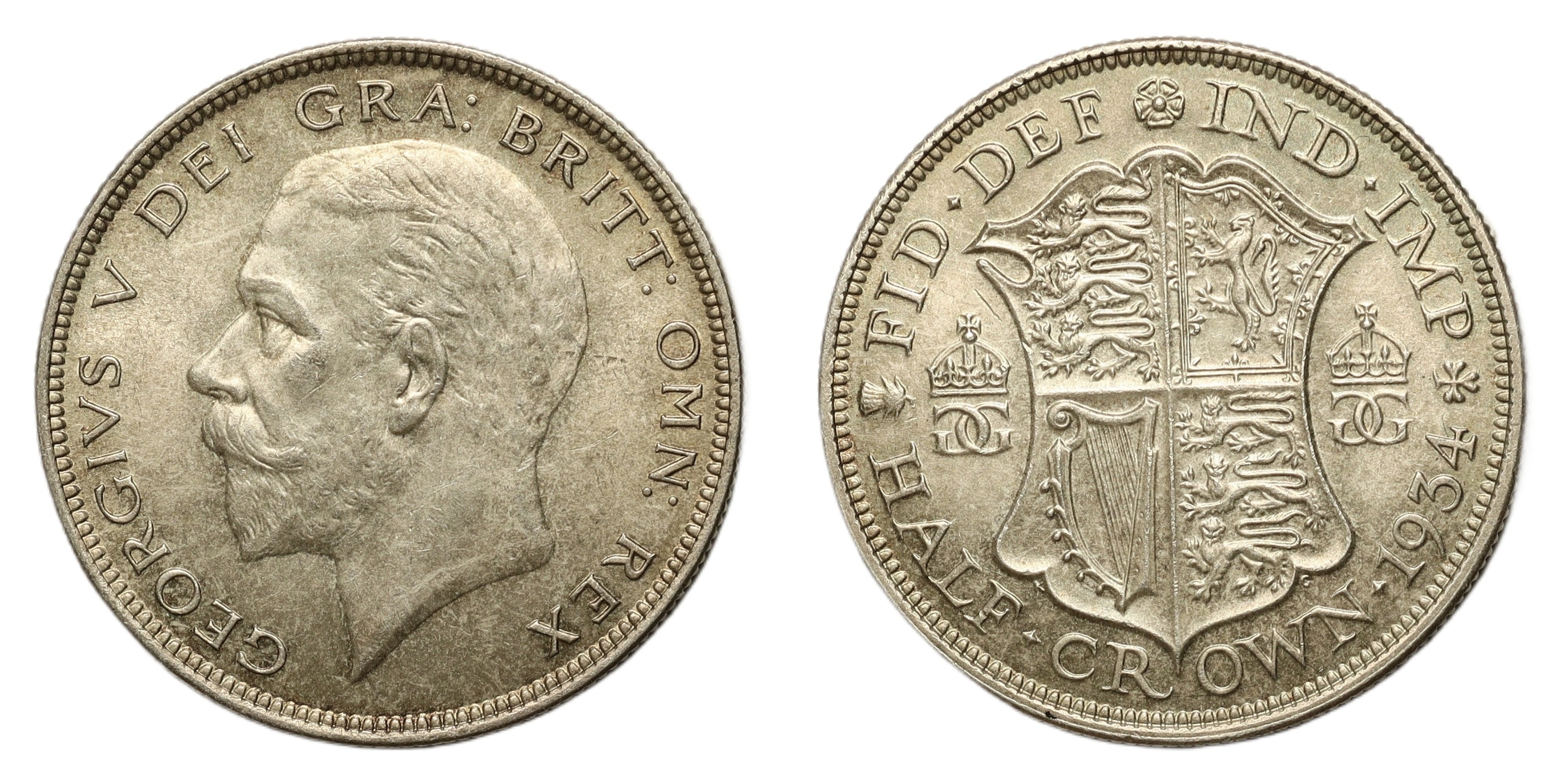 Halfcrown, 1934, fourth coinage, bare head left, rev. shield dividing crowned monograms, (SCBC 4037, ESC 783, Bull 3747). Delightful toning, about uncirculated