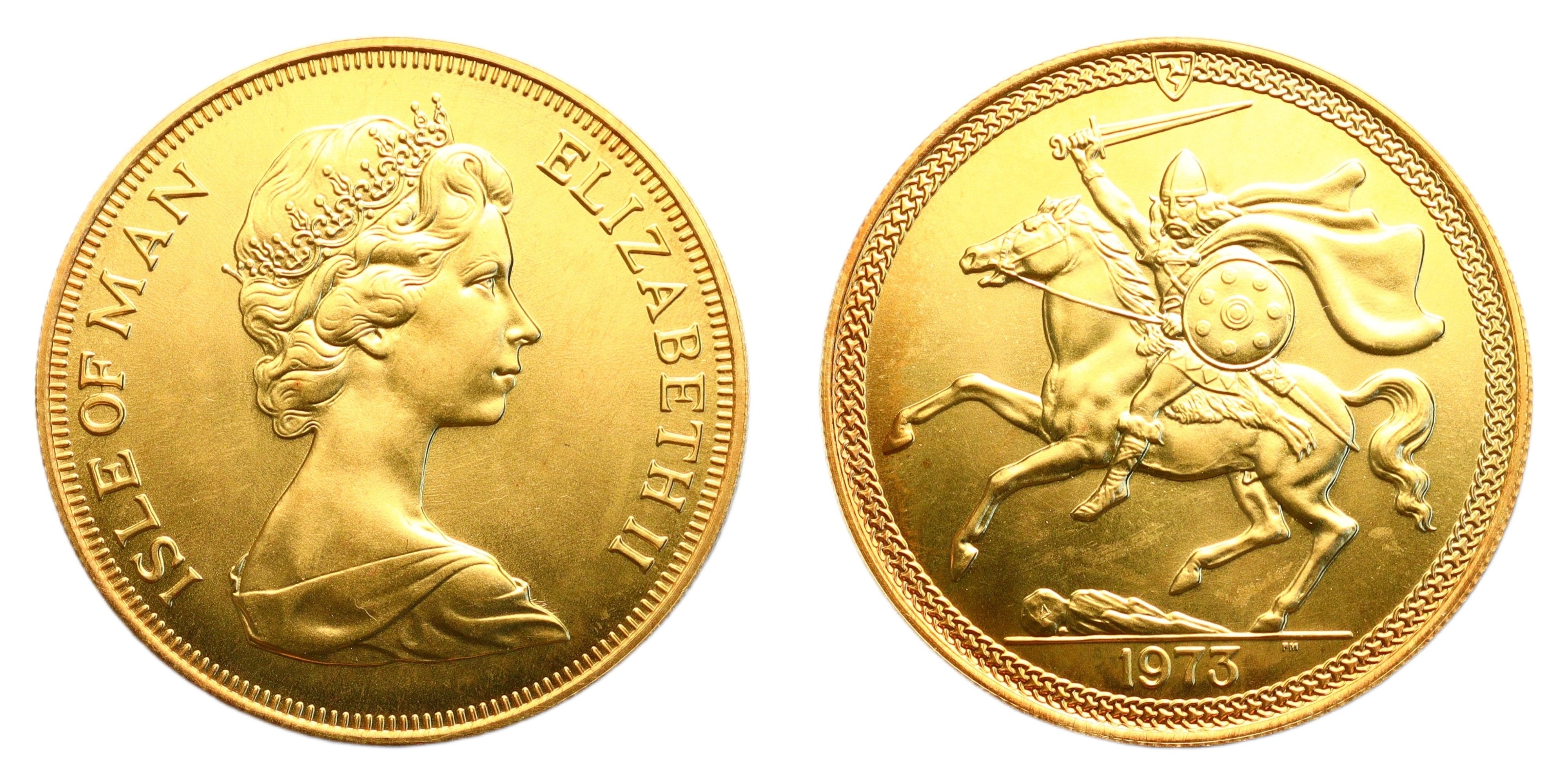 Five Pounds (quintuple sovereign), 1973, crowned and draped bust right, rev. Norse warrior on horseback, date below, (KM 29). Lustrous uncirculated