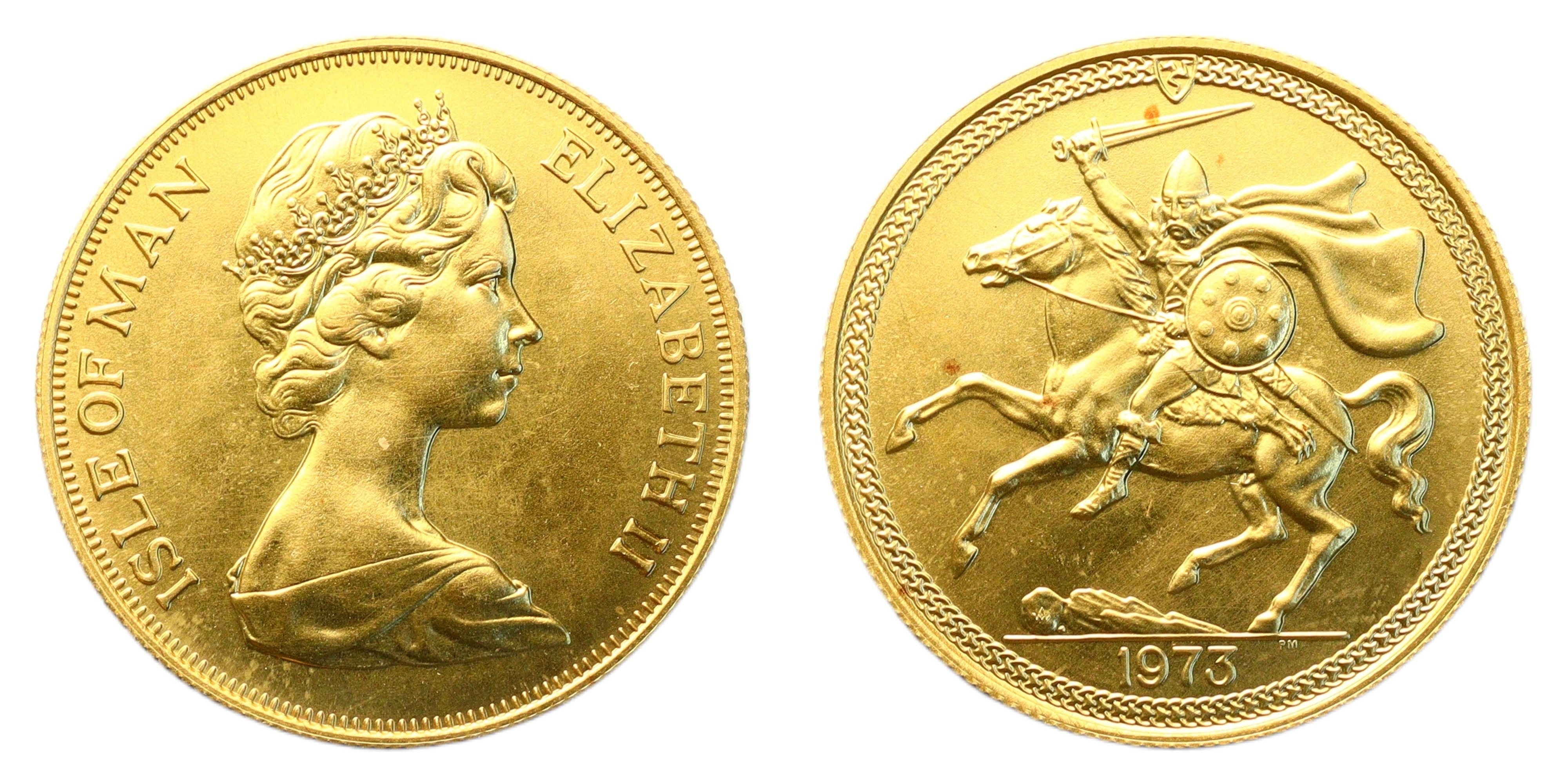 Two pounds (double sovereign), 1973, crowned and draped bust right, rev. Norse warrior on horseback, date below, (KM 28). Some light scratches to obverse, about uncirculated