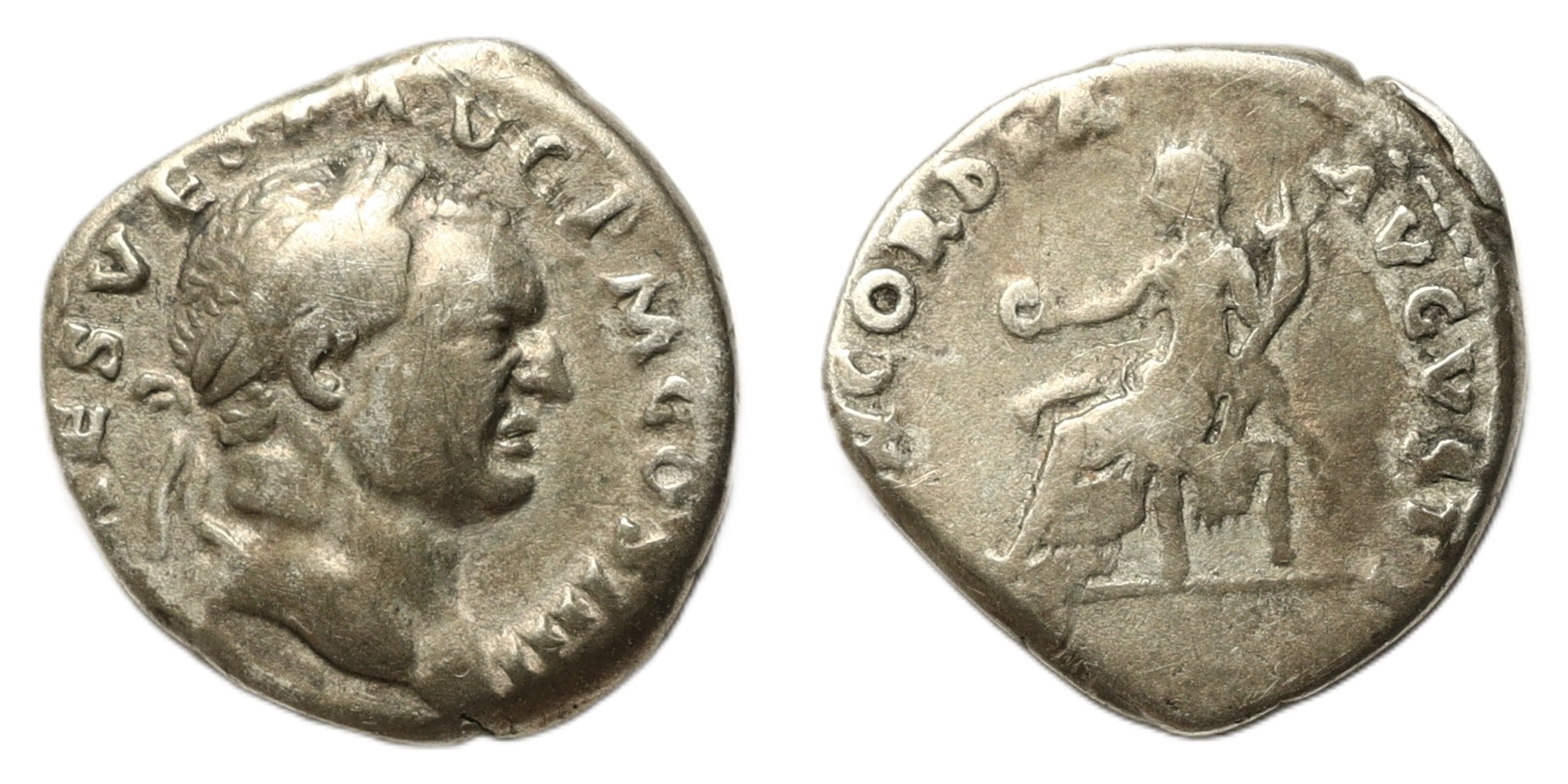 Denarius, Antioch, (72-73 AD), laureate head right, IMP CAES VESP AVG P M COS IIII, rev. Concordia seated left, patera in outstretched right hand, cornucopia cradled in left arm, CONCORDIA-AVGVSTI, 3.32g, (RIC II 1554). Toned, fine