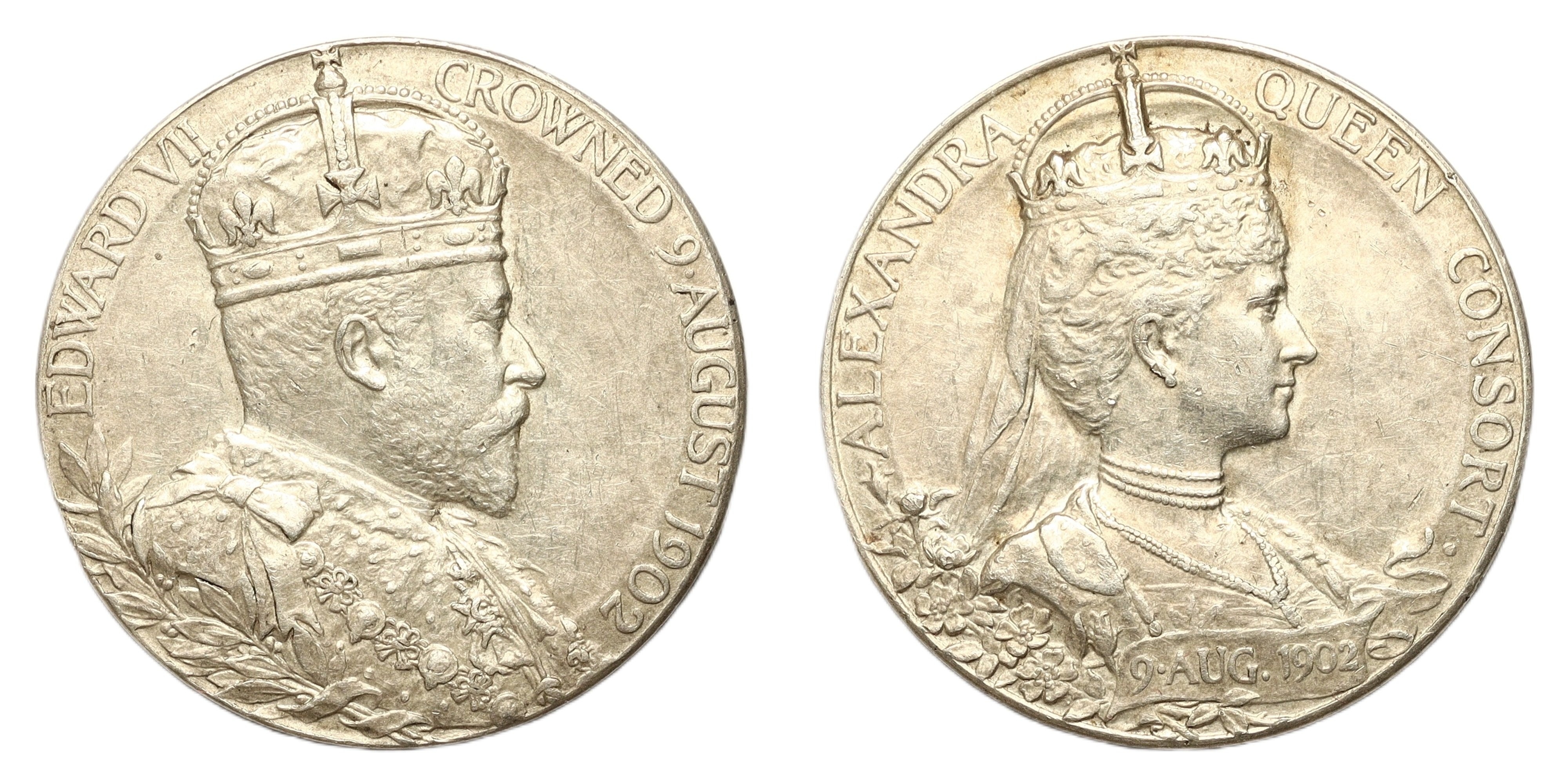 Coronation Medal by G.W. de Saulles, dated 9 August 1902, Edward VII crowned and mantled bust right, wearing collar, rev. Alexandra Queen Consort, crowned and veiled bust right, flowers behind, banner inscribed 9·AUG·1902 below, 30mm, (BHM 3737, Eimer 1871b). Lightly toned, very fine