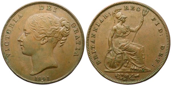 George III Halfpenny, 1806, fourth issue, laureate bust right, date below, rev. Britannia seated, (SCBC 3780) and Farthing,1799, third issue, laureate bust right, date below, rev. Britannia seated, (SCBC 3779) along with a Victoria Penny, 1841, young head left, date below, rev. Britannia seated, (SCBC 3948). All good very fine