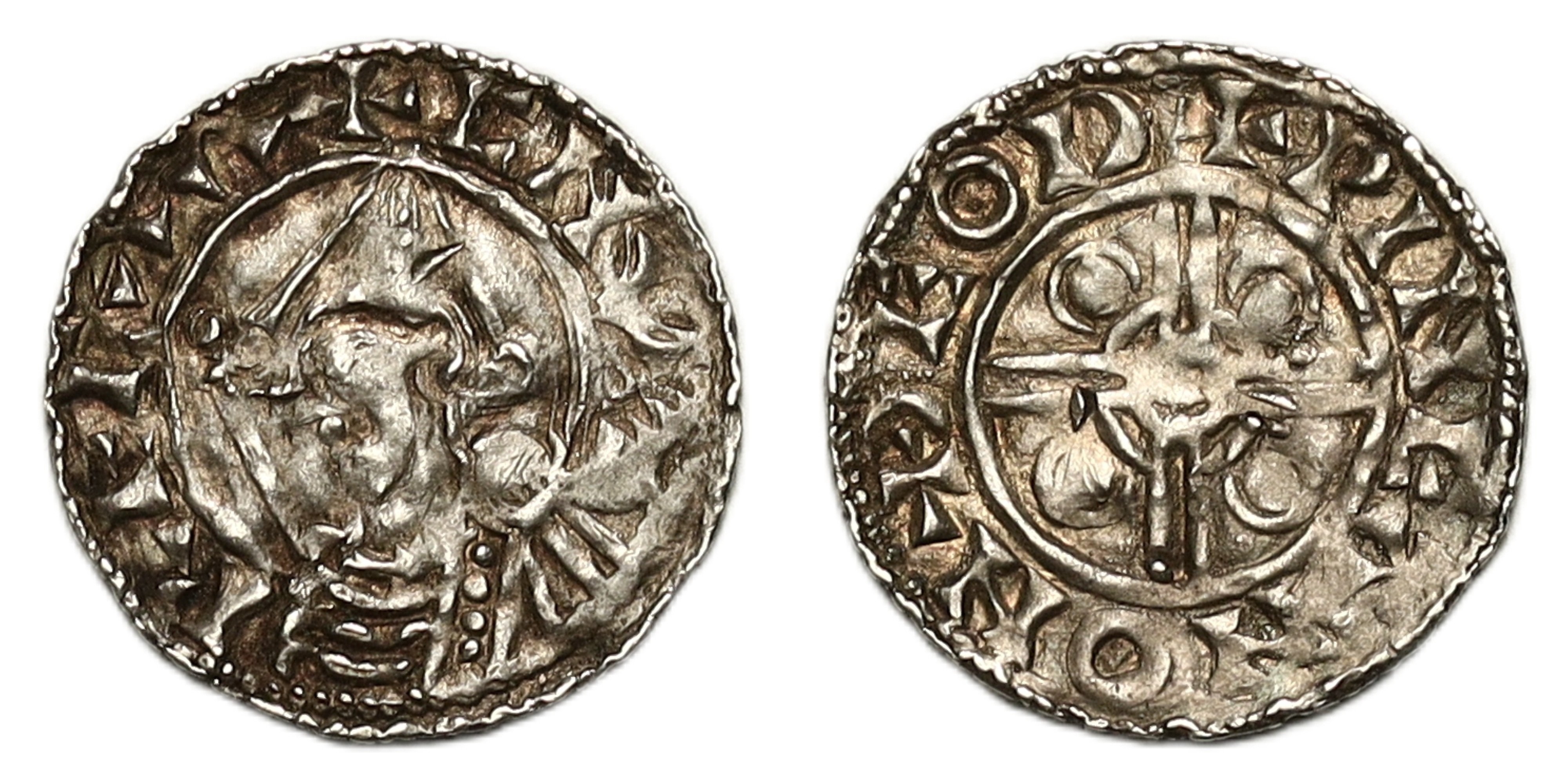 Penny, pointed helmet type, Thetford, moneyer Wineman, helmeted bust left holding sceptre, +CNVT REC X:, rev. short voided cross, pellets in broken annulets in quarters, +PINEMAN ON ĐEOD, 1.07g, (SCBC 1158, N.787). Slightly double struck to obverse, toned, good fine