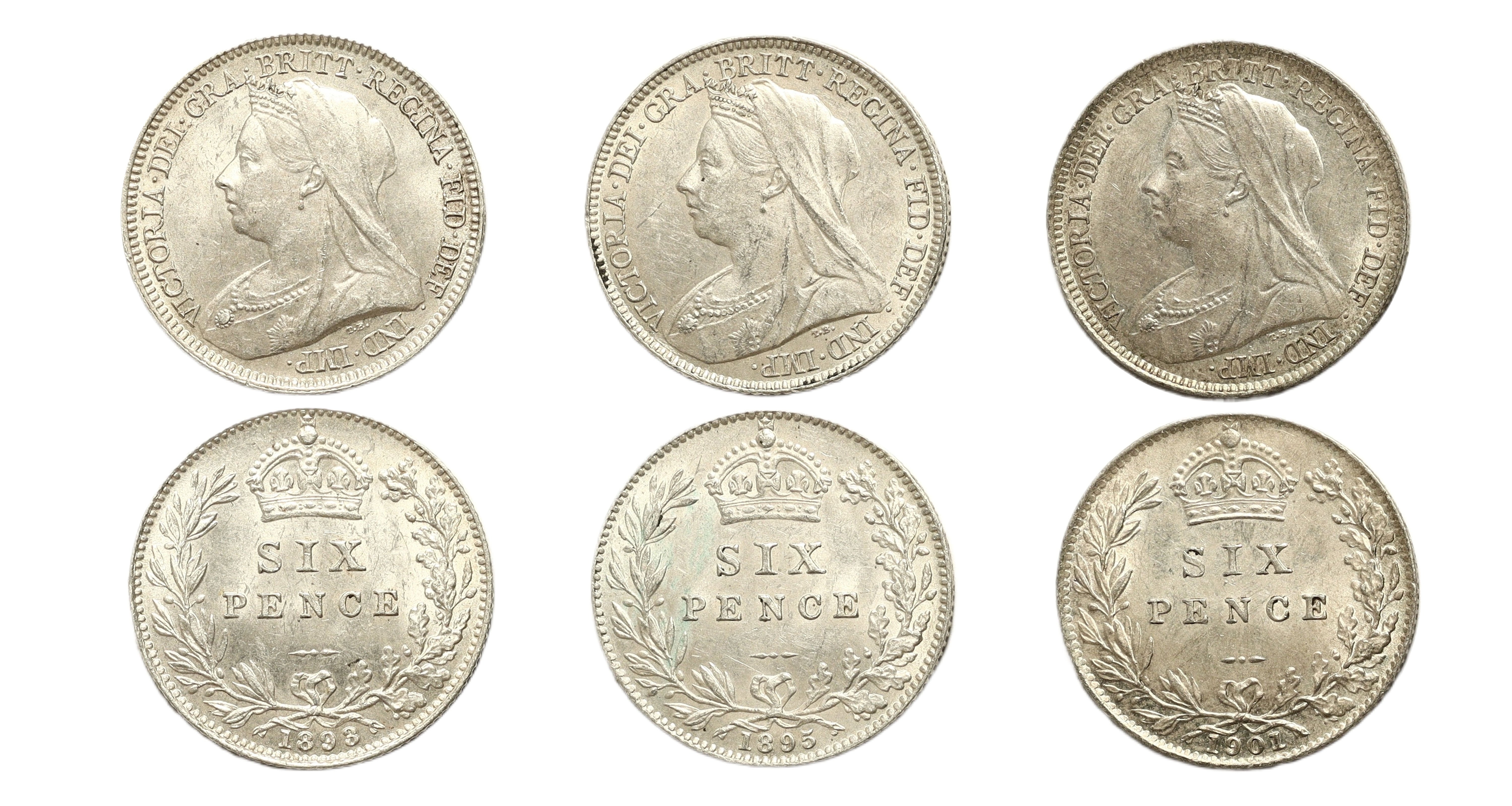 Sixpences, 1893, 1895 and 1901, old veiled bust left, rev. crowned value in wreath, (SCBC 3941, ESC 1762/1765/1771, Bull 3285/3288/3294). Generally about extremely fine