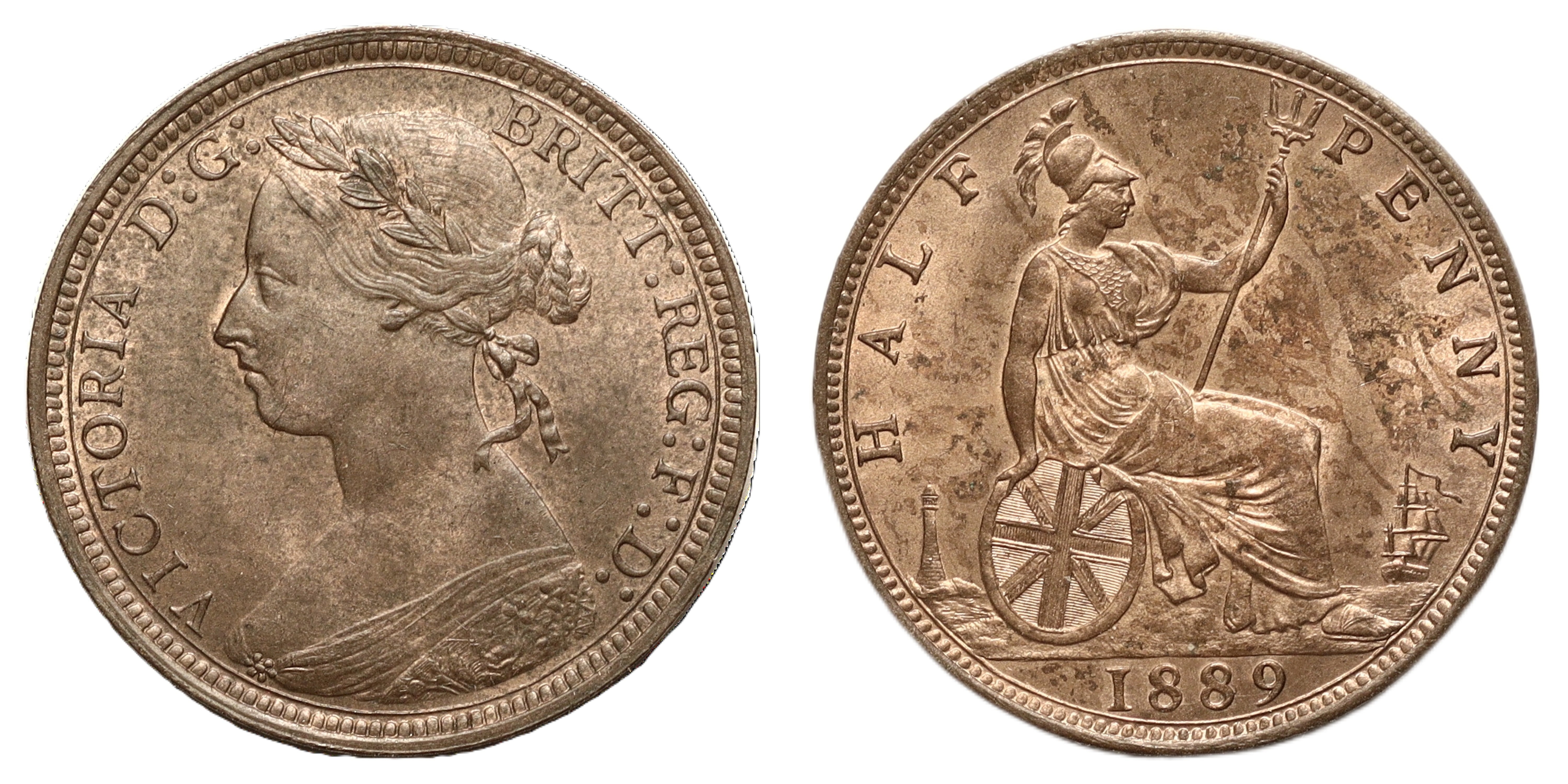 Half Penny, 1889, bun head left, rev. Britannia seated, date below, (SCBC 3956). Underlying lustre to obverse, more to reverse, about extremely fine