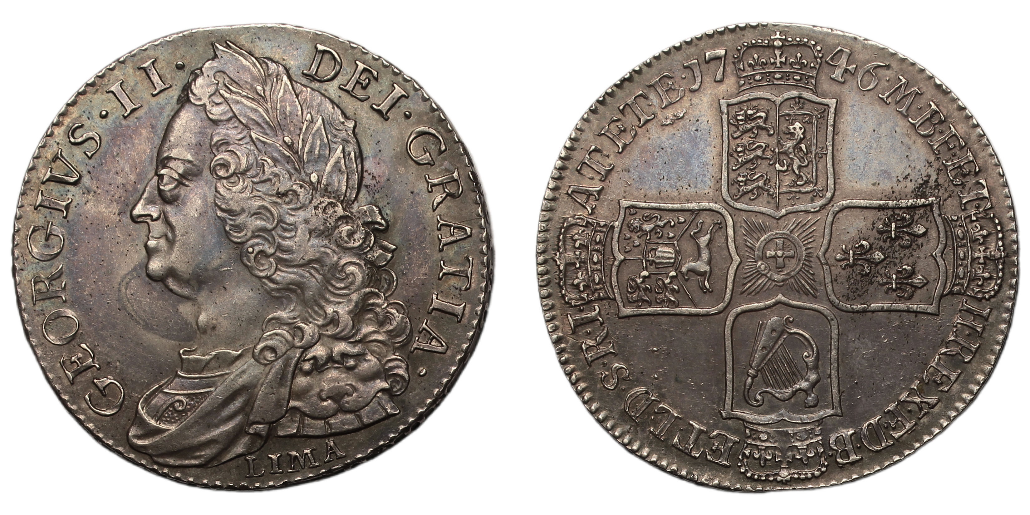 Halfcrown, 1746, old laureate and draped bust left, Lima below, rev. crowned cruciform shields, angles plain, edge D. NONO, (SCBC 3695A, ESC 1688). A little tin flecking under the tone, otherwise extremely fine