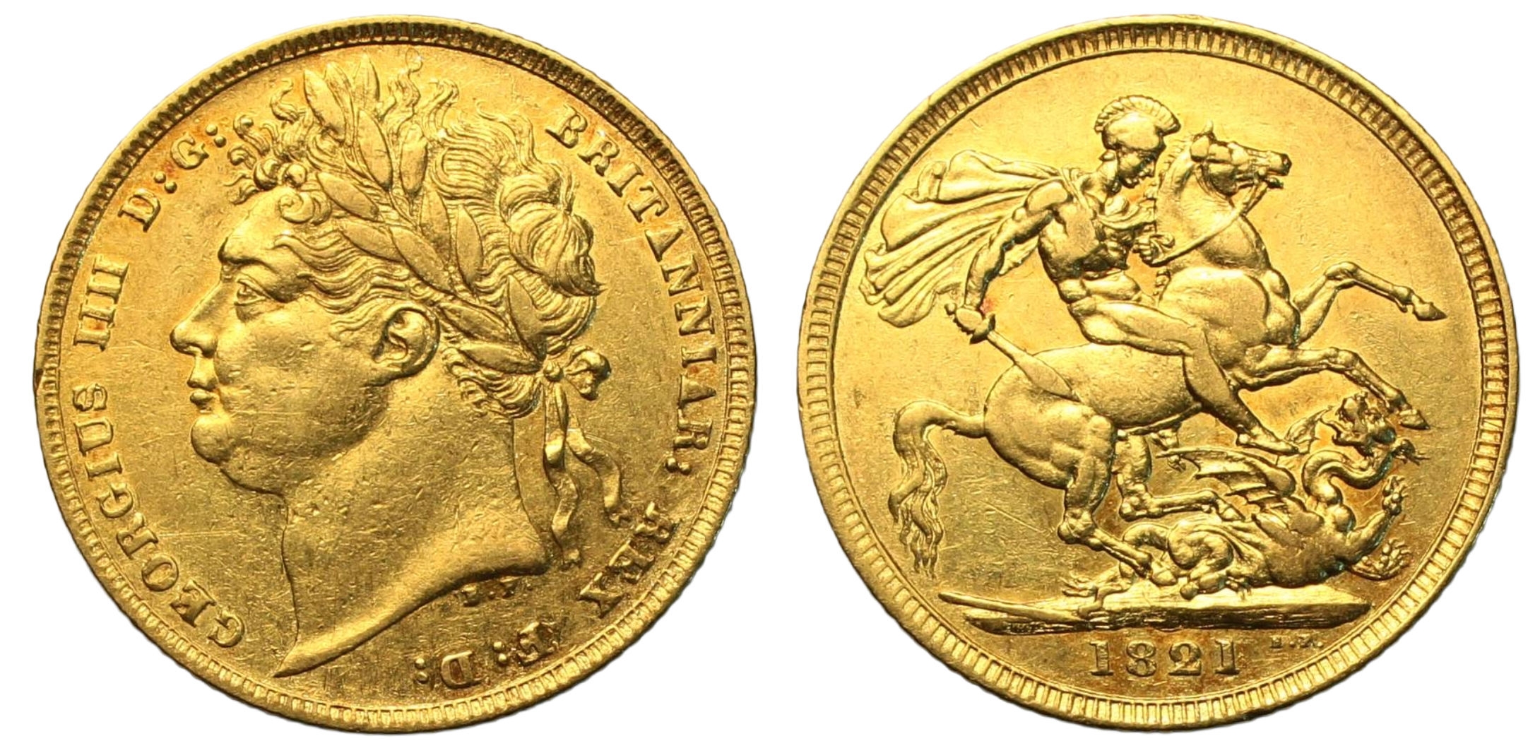 Sovereign, 1821, laureate head left, rev. St. George slaying dragon, date below, (SCBC 3800, Marsh 5). Very fine