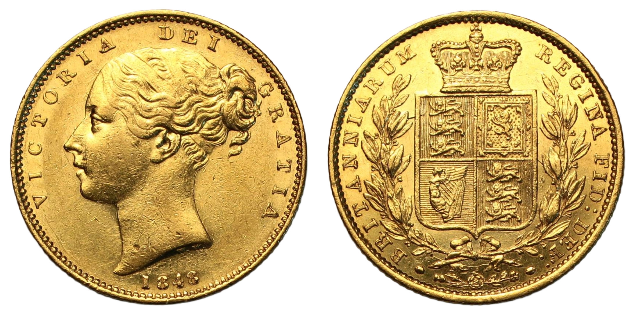 Sovereign, 1848 second young head left, date below, rev. crowned shield within wreath, (SCBC 3852C, Marsh 31). Good very fine